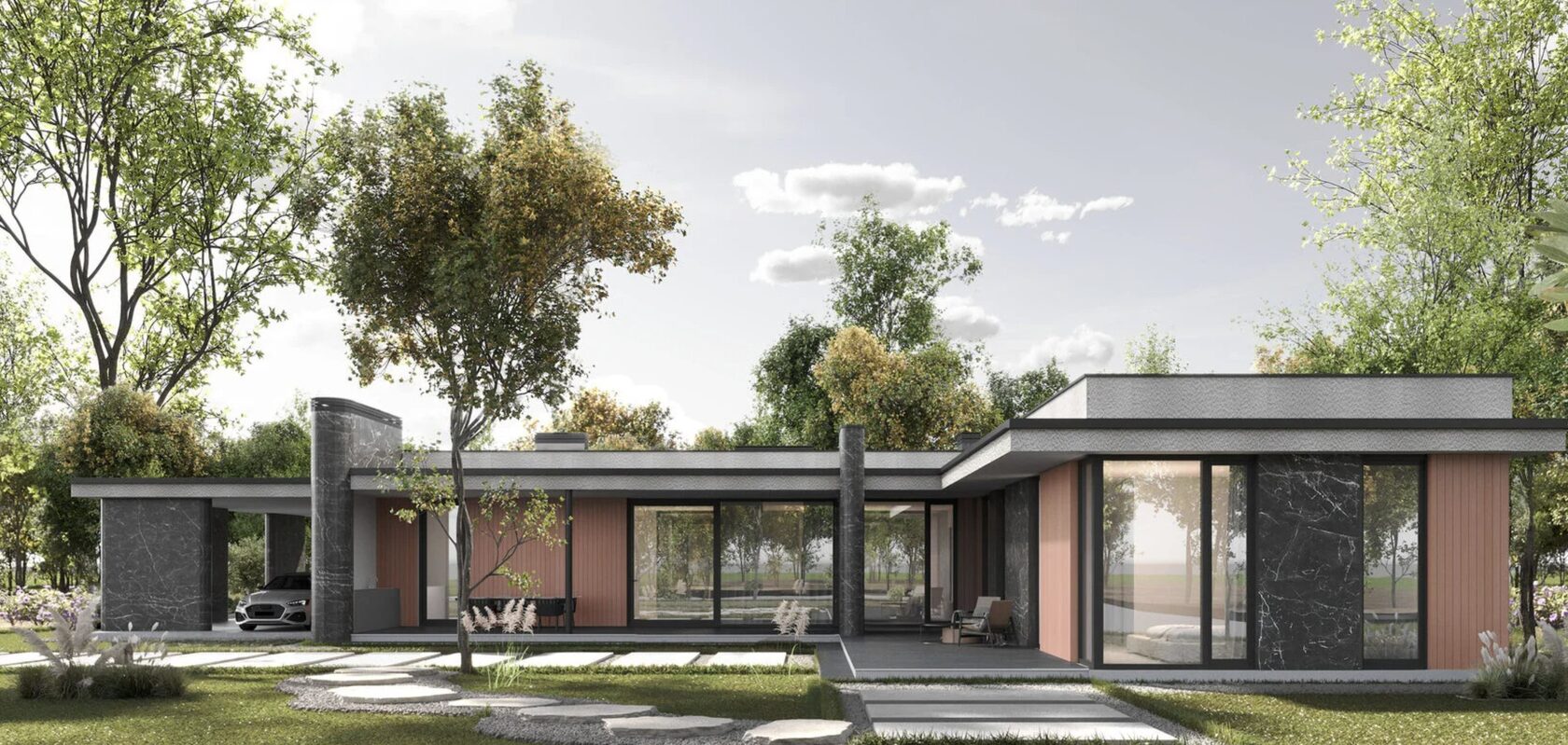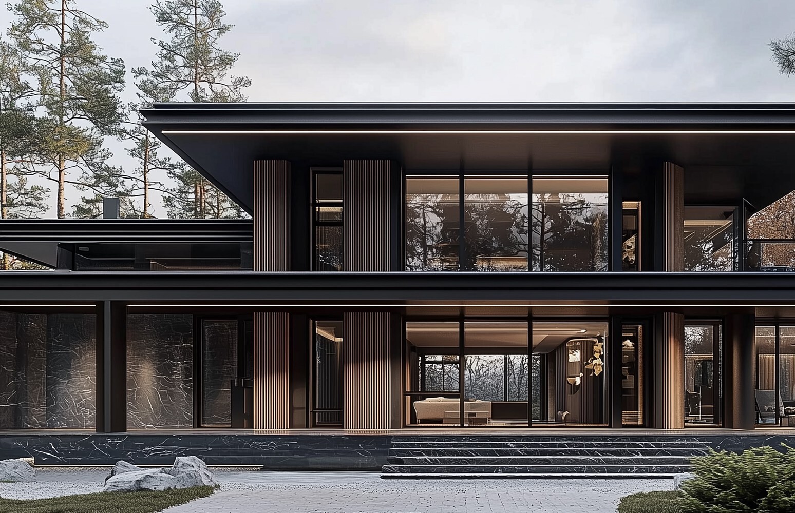 Этот современный дом — пример минимализма, в котором геометрия и природа вступают в тонкий диалог. Лаконичный силуэт здания подчеркивает горизонтальность, а материалы, создают баланс строгости и тепла. Фасады собраны из контрастных материалов: гладкий бетон, вертикальные панели из дерева и темные вставки, которые добавляют глубины. Панорамные окна открывают дом навстречу лесу, впуская внутрь мягкий дневной свет.