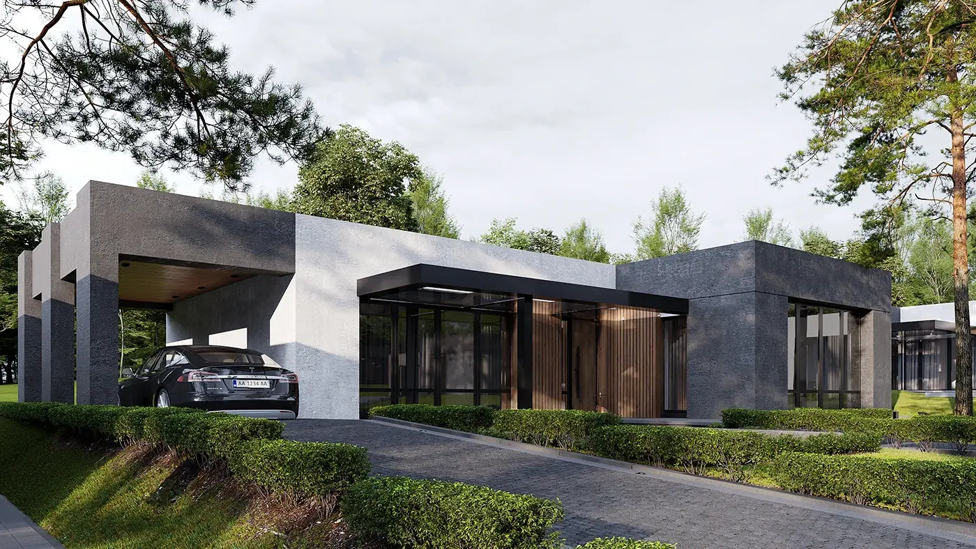 Со стороны улицы этот дом выглядит лаконично и сдержанно: строгая геометрия, белые фасады и узкие окна создают ощущение приватности. Акцентная отделка деревом мягко выделяет вход, а минималистичные линии подчёркивают современный характер архитектуры.