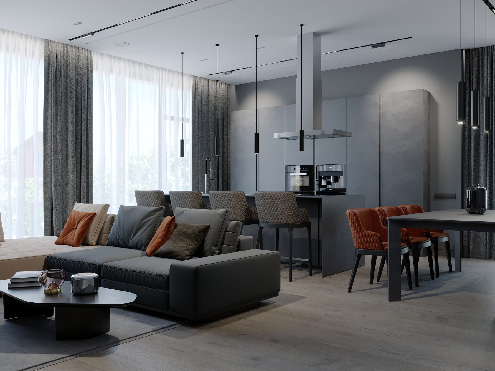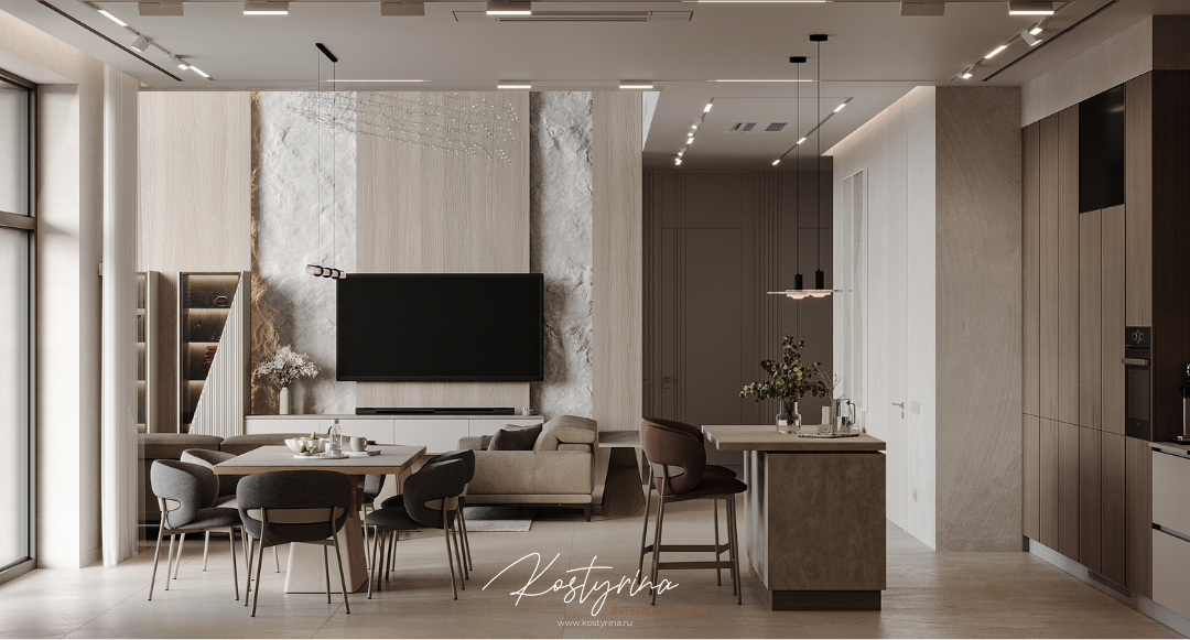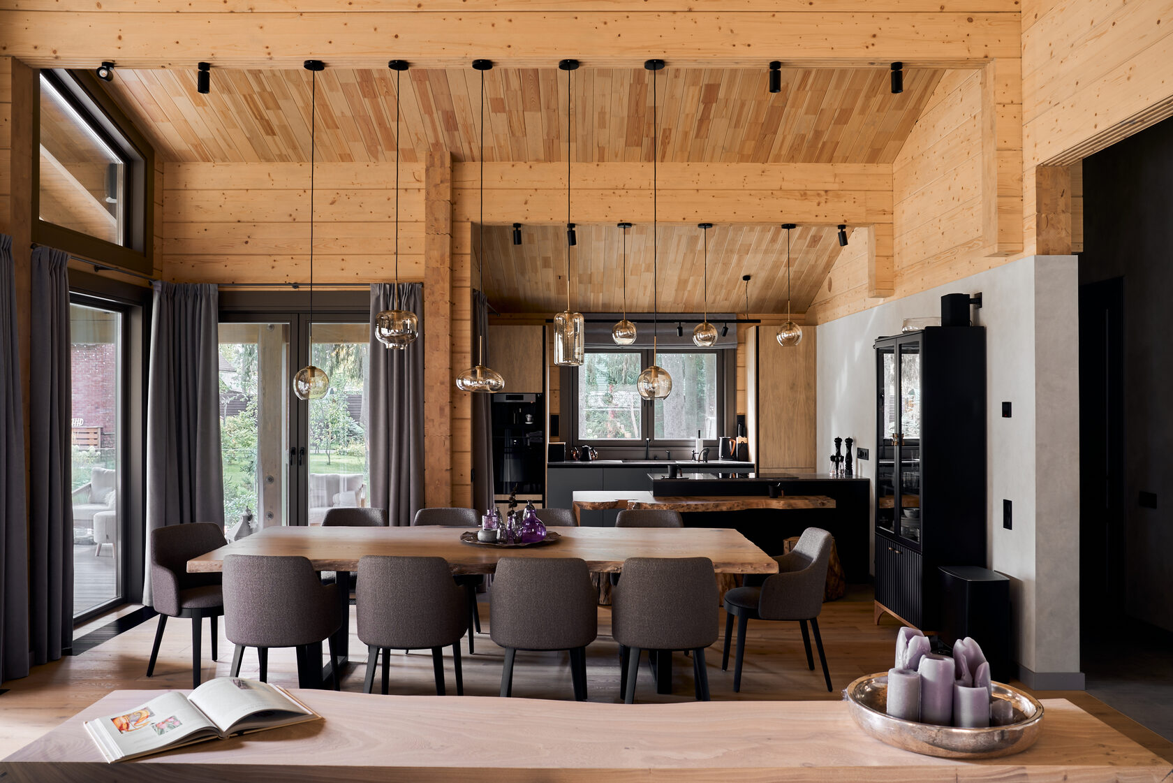 Большое объединённое пространство гостиной и кухни формирует центр дома — место, где собирается семья. Серые акценты, текстиль и камень уравновешивают тепло дерева, делая интерьер современным, но при этом сохраняя свою аутентичность.